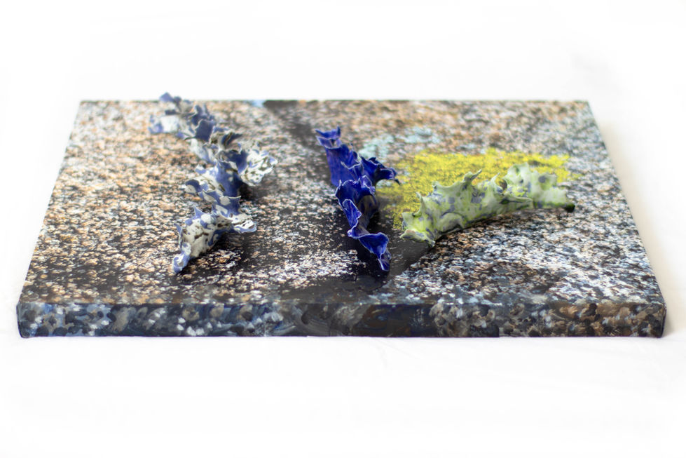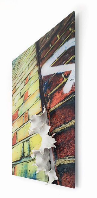 Fertile Rock, 2019, porcelain, glaze, photo and acyclic on canvas 16”h x 20”w x 5”d