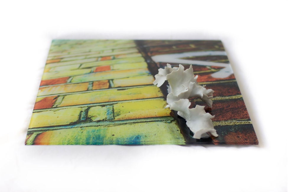Cinnamon Shadow, 2019, porcelain, glaze, photo and acyclic on canvas 16”h x 20”w x 5”d
